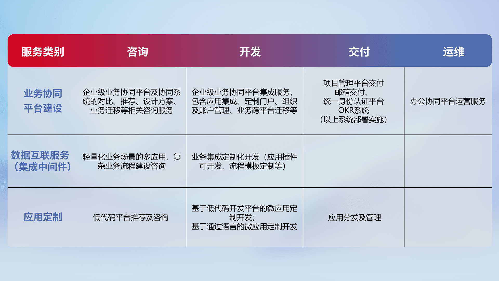 针对钉钉、、、、企微、、、IDaas等平台级产品提供产品的规划、、、、方案、、、、交付、、、定制化开发等服务,,,,实现如统一协同办公、、、智能客户服务、、混合会议管理、、智能数据查询、、等业务场景,,,实现数字化转型。。