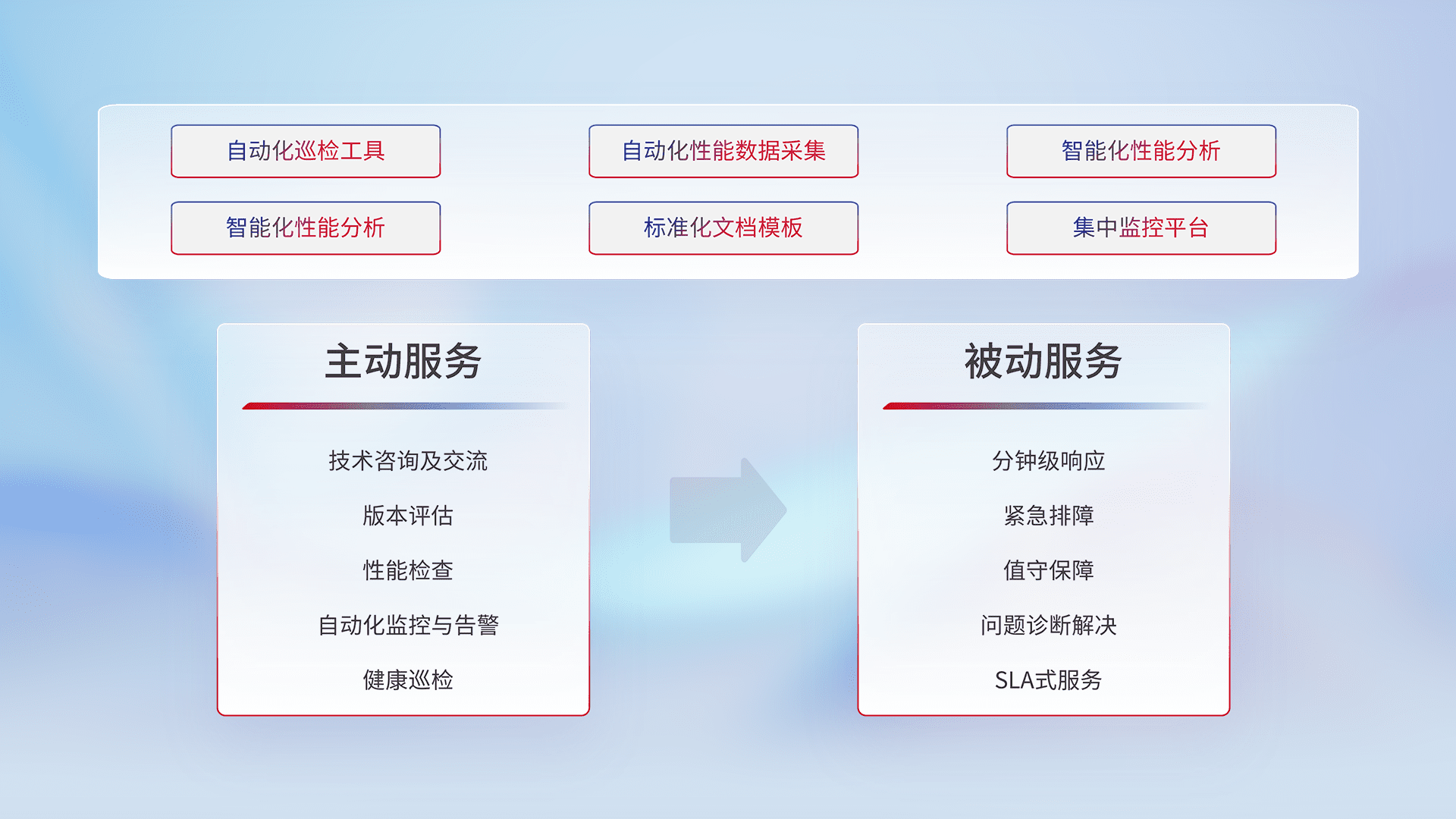 智能化工具和标准化文档,,,,保障服务质量,,提供主动服务(包含技术咨询、、、版本评估、、、性能检查、、自动化监控与告警、、、、健康巡检)和被动服务包含(分钟级响应、、、、紧急排障、、、值守保障、、、、问题诊断解决、、、SLA服务)。。。