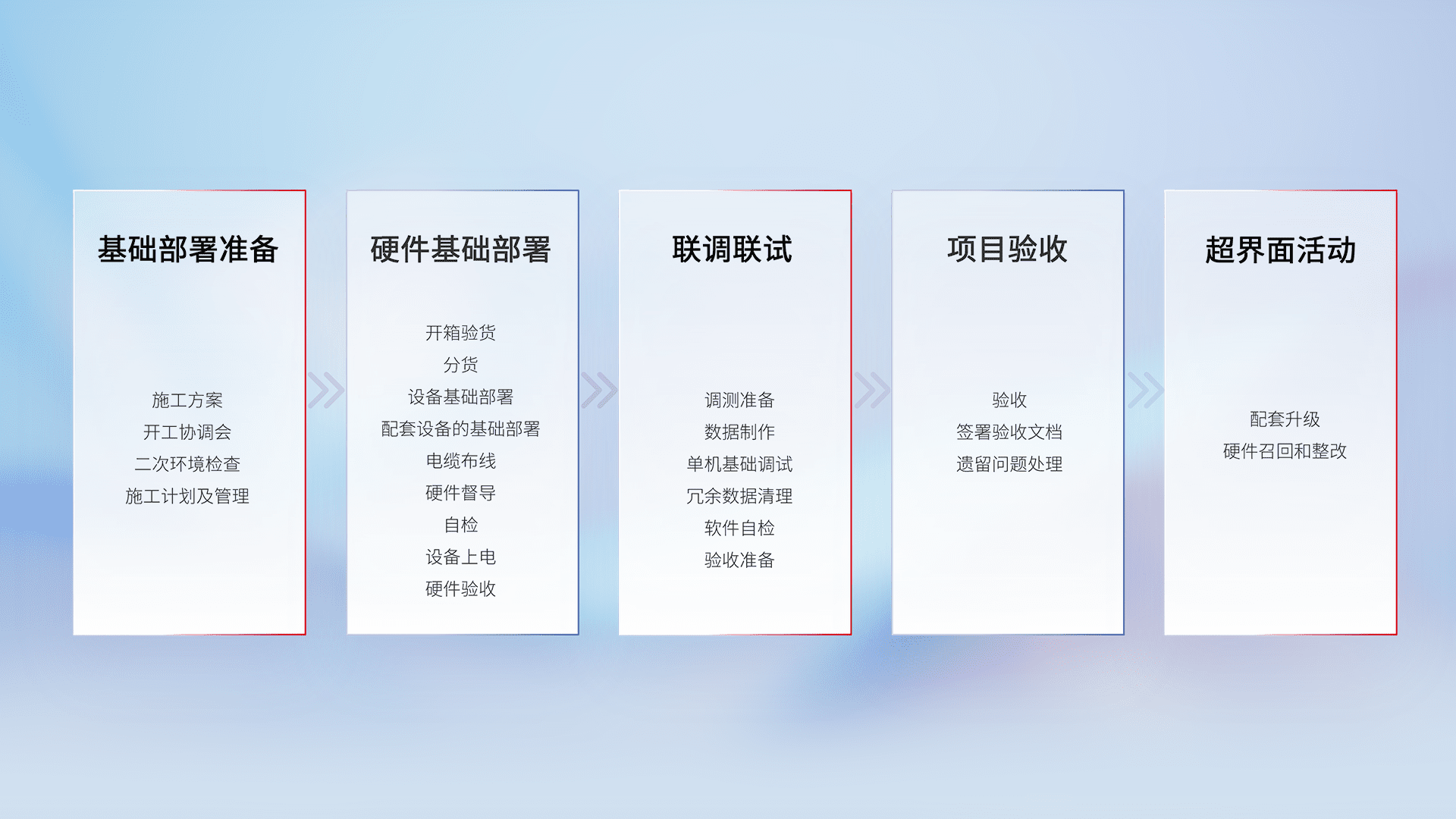 从基础部署准备、、、硬件基础部署、、、、联调联试、、项目验收、、、越界面活动的全过程可追溯,,,保证施工质量和进度。。